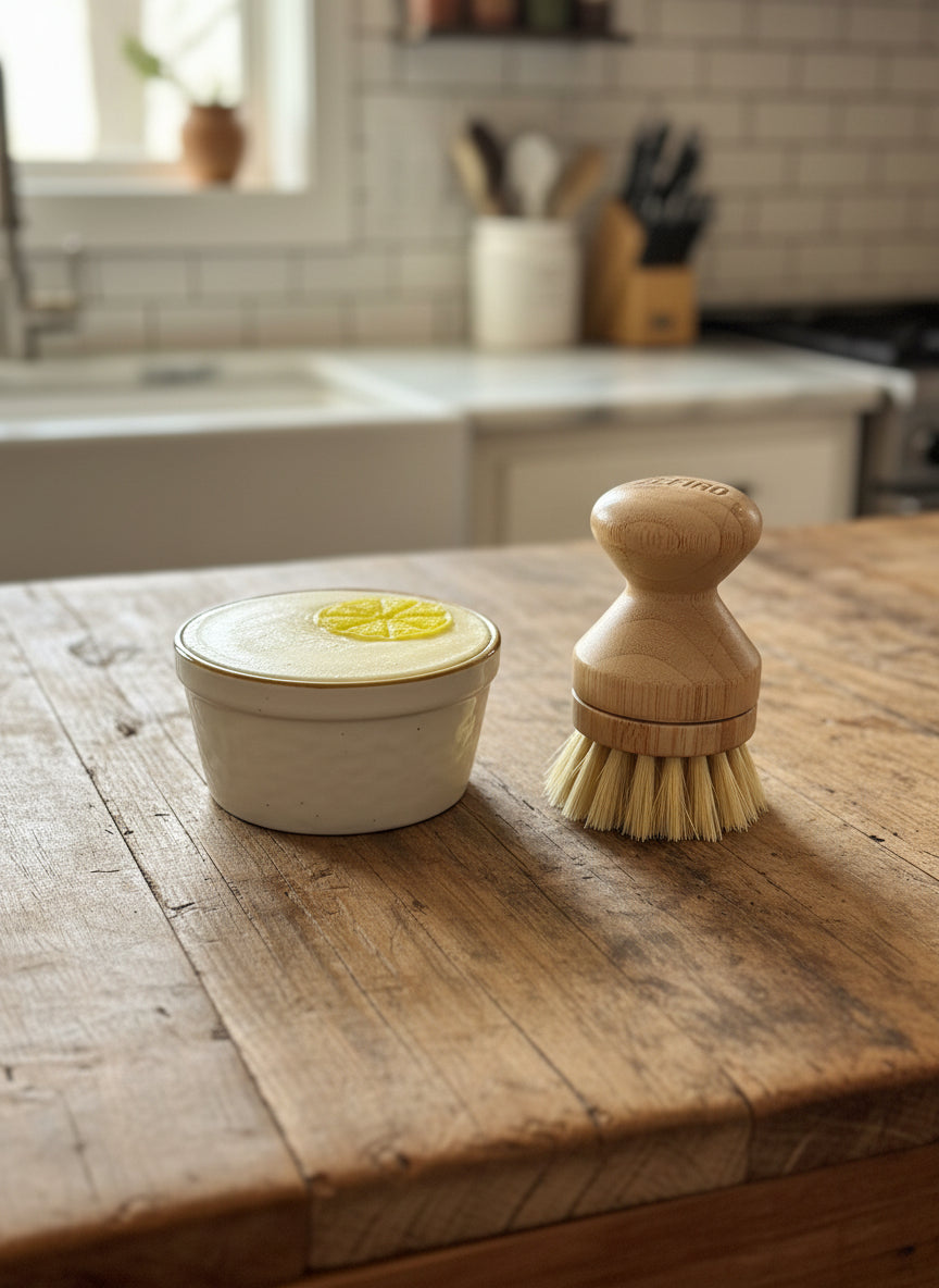 This set comes with 4+ oz of solid dish soap, scented with an orange citrus essential oil in a 4 oz cream ceramic ramekin.